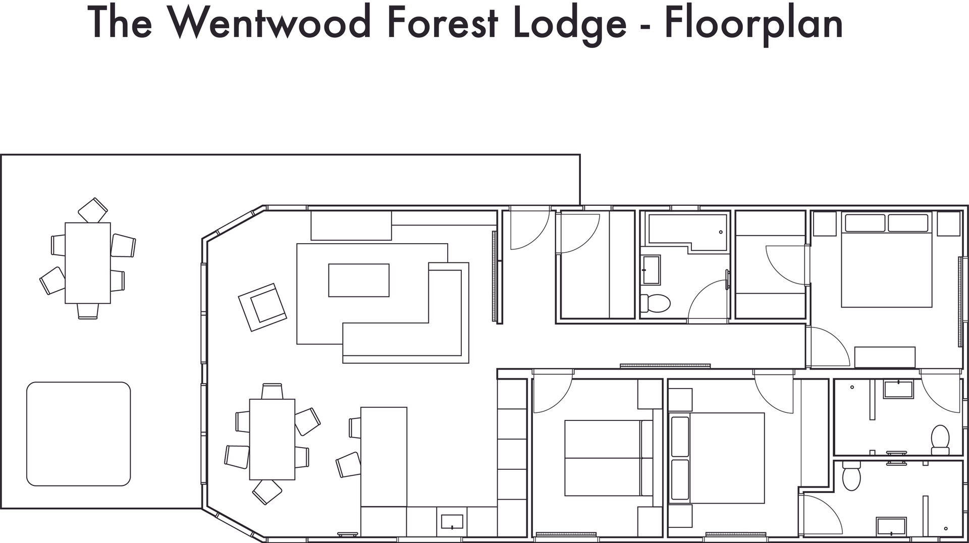 The Wentwood Lodges each offer 1100 square foot internal space, perfect for families and groups with three bedrooms. A master suite incorporates a large king sized bed, walk-in wardrobe and ensuite facilities. The lodge also has a double bedroom with king sized bed and ensuite facilities as well as a third twin bedroom. The family bathroom incorporates a bath with an integral shower.